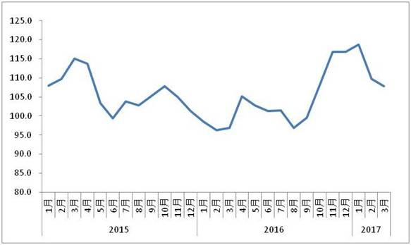 从月内各周指数看,呈现“,前低后高”的走势:其中,月内三周连续回落;月末则止跌回升。综合来看,月内周指数虽环比回落,但总体仍高于上年同期水平,一季度指数平均为111.4点,比上年同期增长14.5%。