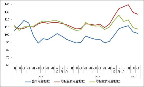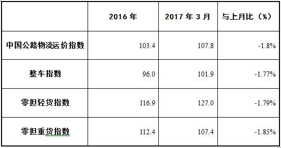 由中国物流与采购联合会和林安物流集团联合调查的中国公路物流运价指数2017年3月为107.8点,比上月回落1.8%,运价指数在连续两个月回落。